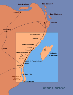From north to south: Puerto Morelos, Tres Ríos, Playa del Carmen, Xcaret, Paamul, Puerto Aventuras, Xpu Há, Akumal, Xel-Há, Bahía de Punta Soliman, Tankah, Tulum, Boca Paila, Punta Allen.